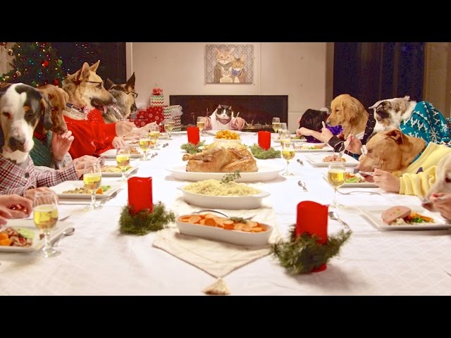 На видео хозяин ужина, пока собаки бодро стучат вилками и наслаждаются ростбифом, кот воротит нос от еды на рождественском столе.
