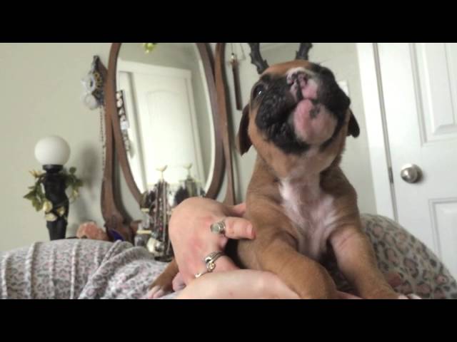 Щенок пытается научиться выть. Как результат – трехнедельный боксер лишь слабо попискивает, трогательно подвывает и даже прихрюкивает от усердия.