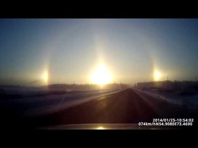 А 17 февраля на Урале было около 25 градусов мороза. В воздухе образовались особые ледяные кристаллы, которые преломили солнечный свет и в небе появилось три Солнца, вместо двух.