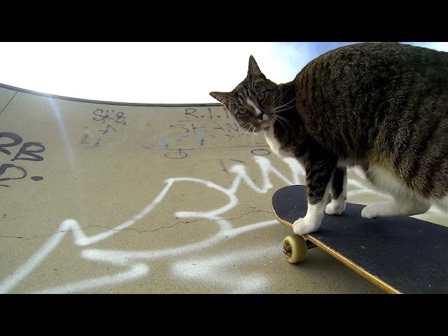 Кот настолько хорошо держится на скейтборде и вписывается в повороты, что остается только восхищенно удивляться. Мастерски преодолевая препятствия, кот умудряется даже поворачиваться на скейте. Все действо засняла камера GoPro. Ролиу уже посмотрело более 3 миллионов 300 тысяч пользователей. И это явно не предел – ведь кот показывает настоящий мастер-класс.