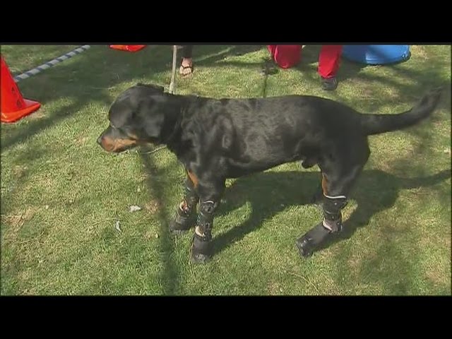 Большой и сильный пес породы ротвейлер впервые в своей жизни смог ходить благодаря протезам. Животное еще щенком было брошено хозяином в сильные морозы на улице. В результате собака получила обморожения четырех лап и ей пришлось ампутировать их нижнюю часть.