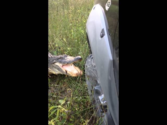 В сети появилось и тут же стало хитом видео, на котором аллигатор с легкостью оторвал бампер автомобиля.