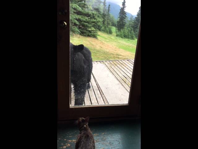Черный медведь подошел к стеклянной двери дома. Некоторое время животные приглядывались друг к другу через стекло, затем кошка резко совершила прыжок, напугав лесного зверя. Тот попятился назад, оступился и чуть не свалился с крыльца.