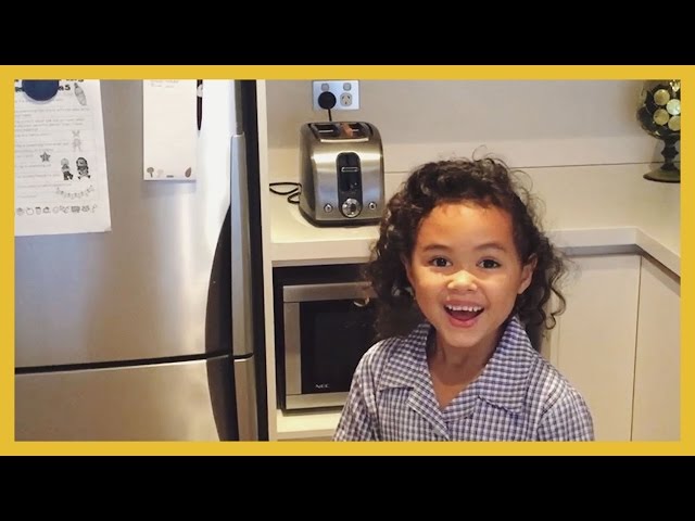 Девочка стоит спиной к тостеру, корзине или холодильнику, а затем забрасывает туда хлеб или пакет молока. И все попадает точно в цель!