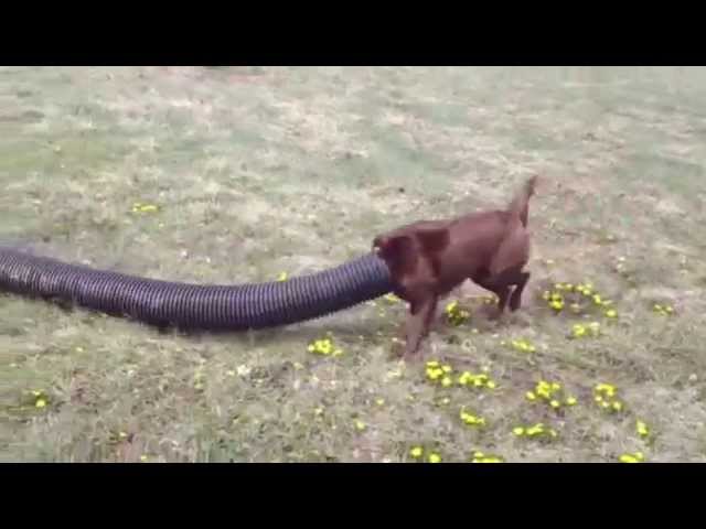 В начале 40-секундного видео пес засовывает голову в отрезок трубы и изо всех сил пытается протиснуться в трубу. Однако вместо этого бегает с трубой по лужайке.