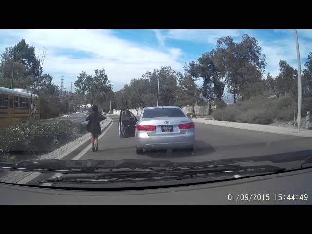 На видео – дорога в Калифорнии. Во время движения автомобиль резко тормозит и из него выскакивает девушка, ехавшая за рулем. Экс-водитель спокойно пошла вдоль трассы, а машина тем временем продолжила движение, выехав на встречную полосу. Авто зацепило два кроссовера (CR-V и Navigator) и выехало на обочину.