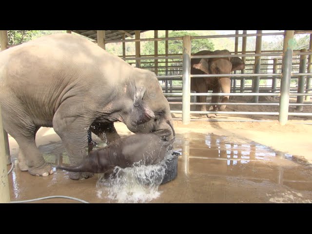 В тайском слоновьем зоопарке купали слоненка в специальной емкости