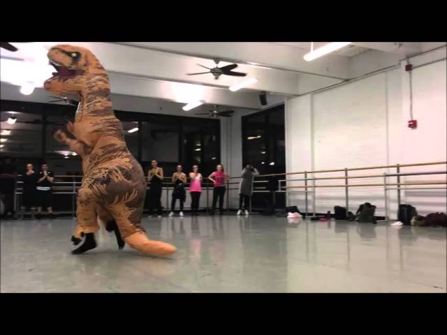 В сети появилось видео с необычной тренировки танцора балетной группы. Мужчина не побоялся надеть костюм гигантского тираннозавра, чтобы доказать, что элегантный танец возможен даже в несуразном костюме.