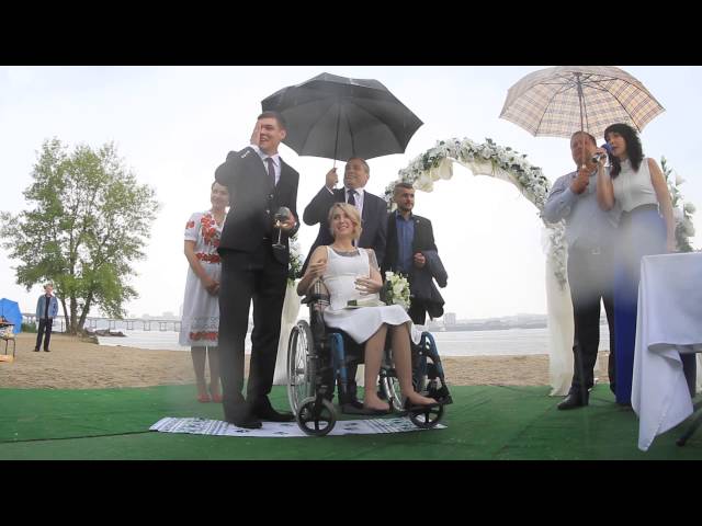 Известная волонтер Яна Зинкевич и ее возлюбленный Максим Кораблев расписались в Воронцовском парке на берегу Днепра. Приехали молодожены не на лимузине, а на большом красно-белом реанимобиле с включенными мигалками. Максим вынес из него Яну на руках и бережно усадил в коляску. Церемонию пришлось проводить под зонтами – дождь грянул в самый торжественный момент и не стихал до окончания росписи.