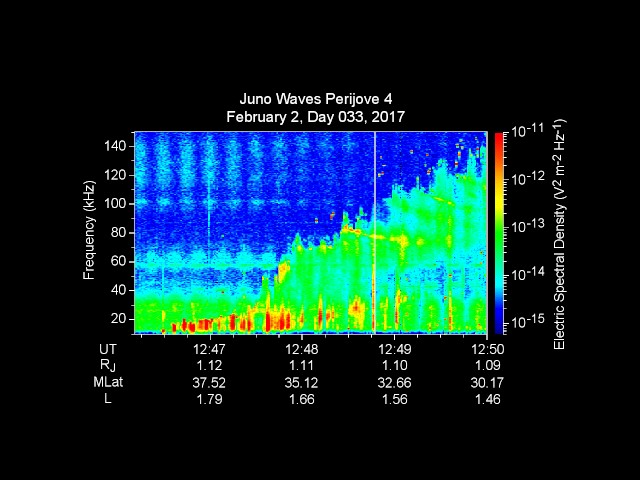 Зонд НАСА под названием Juno ("Юна", "Юнона", в древнеиталийской мифологии супруга верховного бога Юпитера) записал "музыку", которая возникает во время соприкосновения магнитного поля планеты Юпитер и солнечного ветра. Аппарату также удалось сделать снимки колец планеты "изнутри". Об этом рассказали члены миссии зонда на брифинге, 25 мая, сообщили "РИА-Новости".