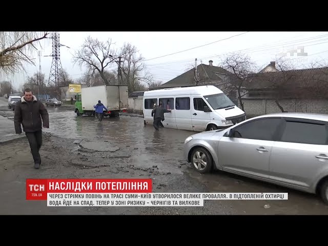 В Сумской области стремительный паводок, начавшийся после быстрого таяния снега, привел к образованию километрового провала вдоль трассы Сумы- Киев. Об этом говорится в сюжете ТСН.