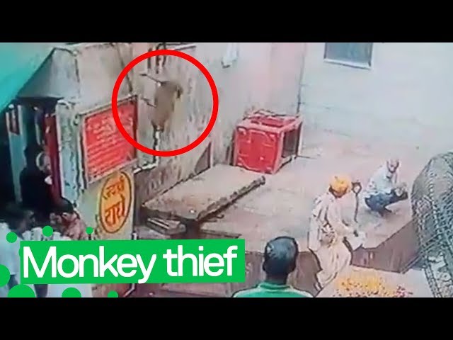 Около храма в Индии дикая обезьяна увидела заклинателя змей, сорвалась с крыши и украла кобру. После этого мужчина бросился догонять "воровку" и полез на крышу. Очевидцы утверждают, что заклинатель не смог вернуть змею.