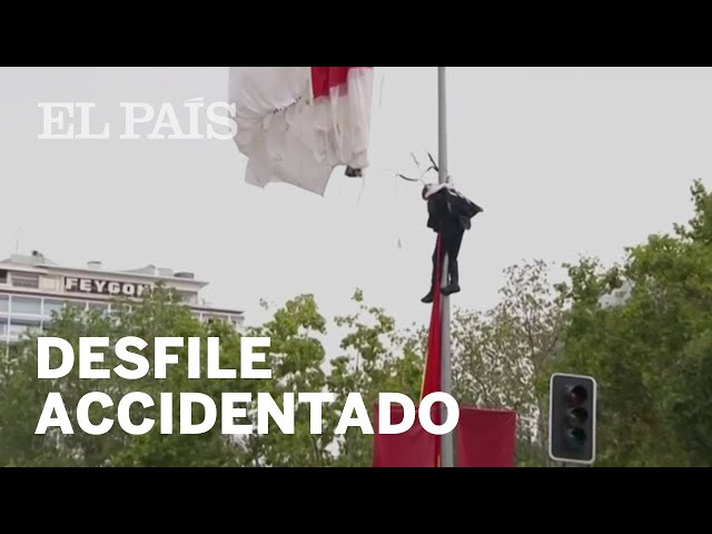На военном параде в Мадриде, посвященном Национальному дню Испании, парашютист при приземлении зацепился за фонарный столб. Об этом сообщает El Pais.