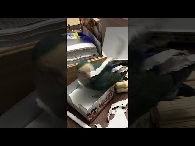 В ролике птичка клюет бумагу в коробке, а потом вставляет белые "перья" в хвост. В комментариях пользователи отметили, что попугай "милый и сообразительный.