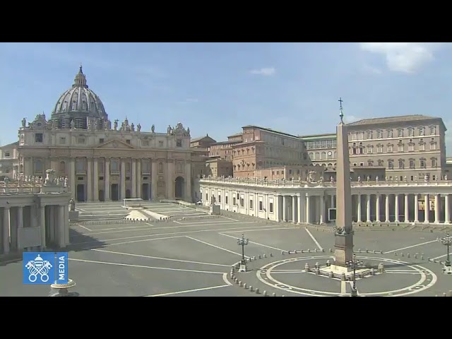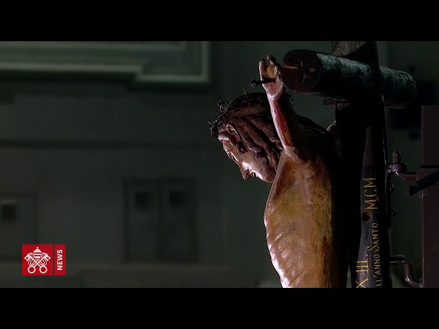 Шествие начали у обелиска в центре площади, а продолжили под навесом, близ которого установили распятие из римской церкви Сан-Марчелло, согласно преданию, спасшее город от чумы в 16 веке.