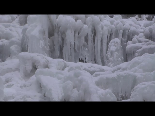 Теперь вместо воды на скалистом склоне можно увидеть сосульки, а у подножия лежит снег. Неизвестно, сколько пробудет он в таком состоянии. Возможно, растает уже через несколько дней.