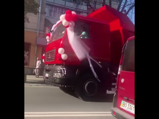 На улицах Киева можно было увидеть необычную свадебную процессию. Об этом телеграм-канал Великий Київ. Вместо лимузинов, "мерседесов" и прочего набившего оскомину стандартного автотранспорта молодожены использовали для свадебного кортежа два украшенных шариками ярких грузовика с плакатами "жених" и "невеста".