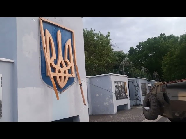 Герб в 2022 году оккупанты сорвали с помощью бронетехники. Новый символ был изготовлен из металла сожженной российской техники.
