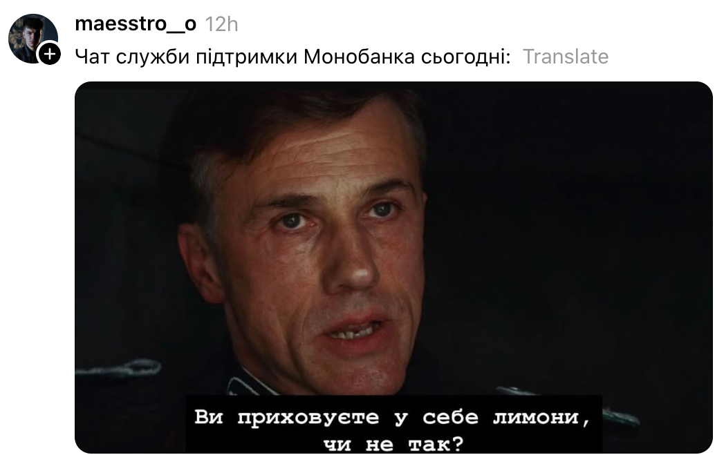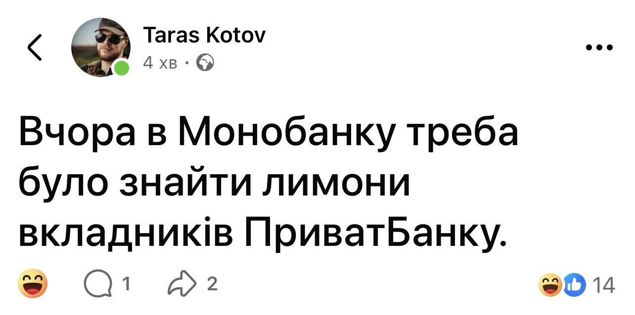 Это еще нам повезло, что лимоны нужно в monobank.ua собирать, а не в "Дії". Так у вас просто будет прикольная салатница или банка «Живчика», а не жена/супруг, какие-то случайные штрафы, судимости и новое имя – принцесса Консуэла Бананагамок. (с) Андрей Домник