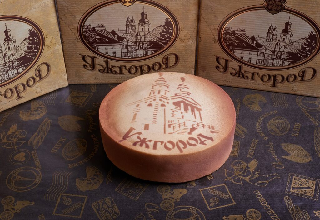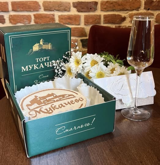 Украшен тортик очертаниями замка Паланок и надписью Мукачево с какао. Картонное оформление лаконичное: зеленая бархатная коробка, на которой вытеснено изображение замка Паланок и надпись «Вкус Закарпатья».