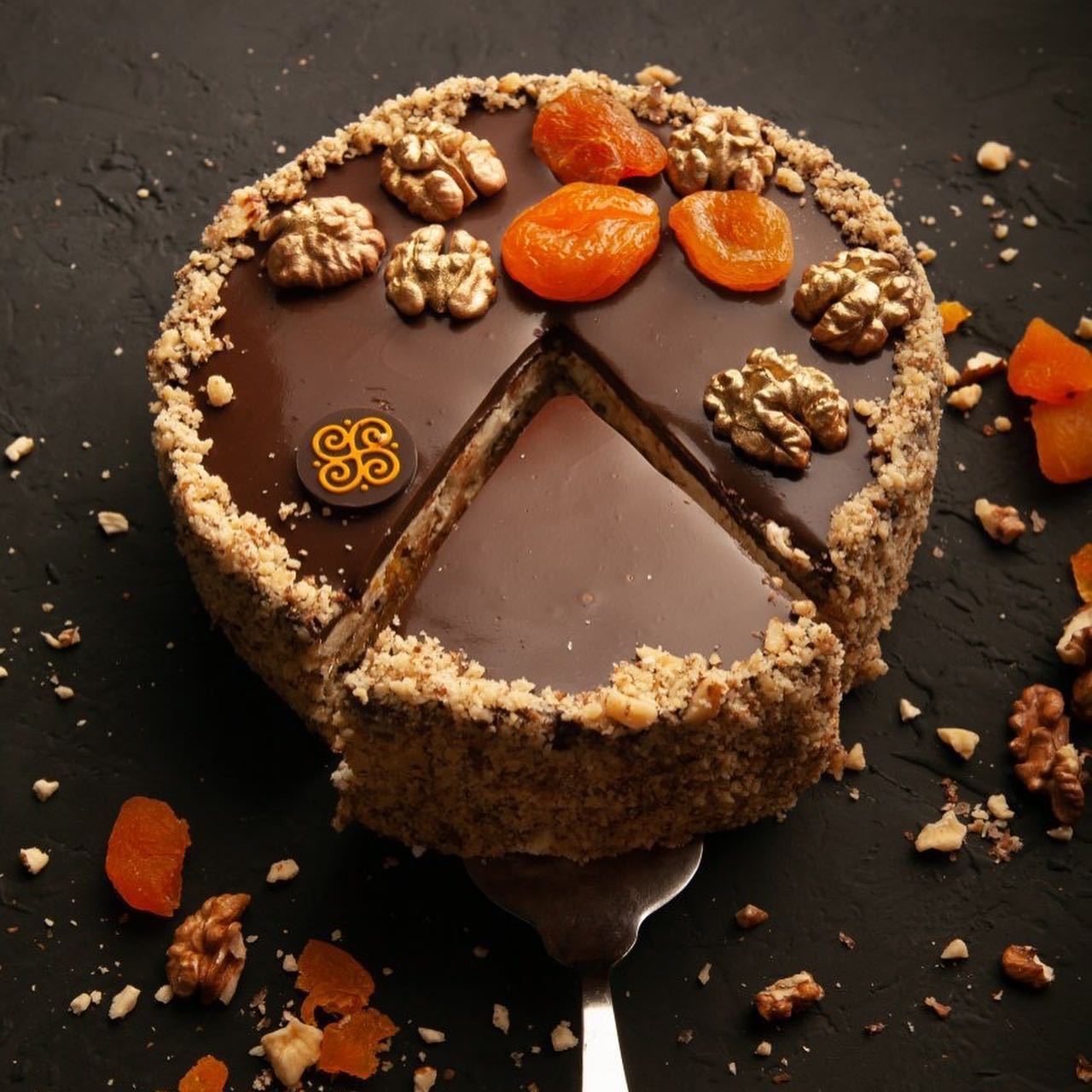 Дизайн торта без изысков - только ганаш, курага, ореховая посыпка. Продается в простенькой коробке с прозрачным «окошечком». Зато десерт удобно перевозить. Те, кто покупал, говорят, что действительно выдерживает транспортировку на дальние расстояния.
