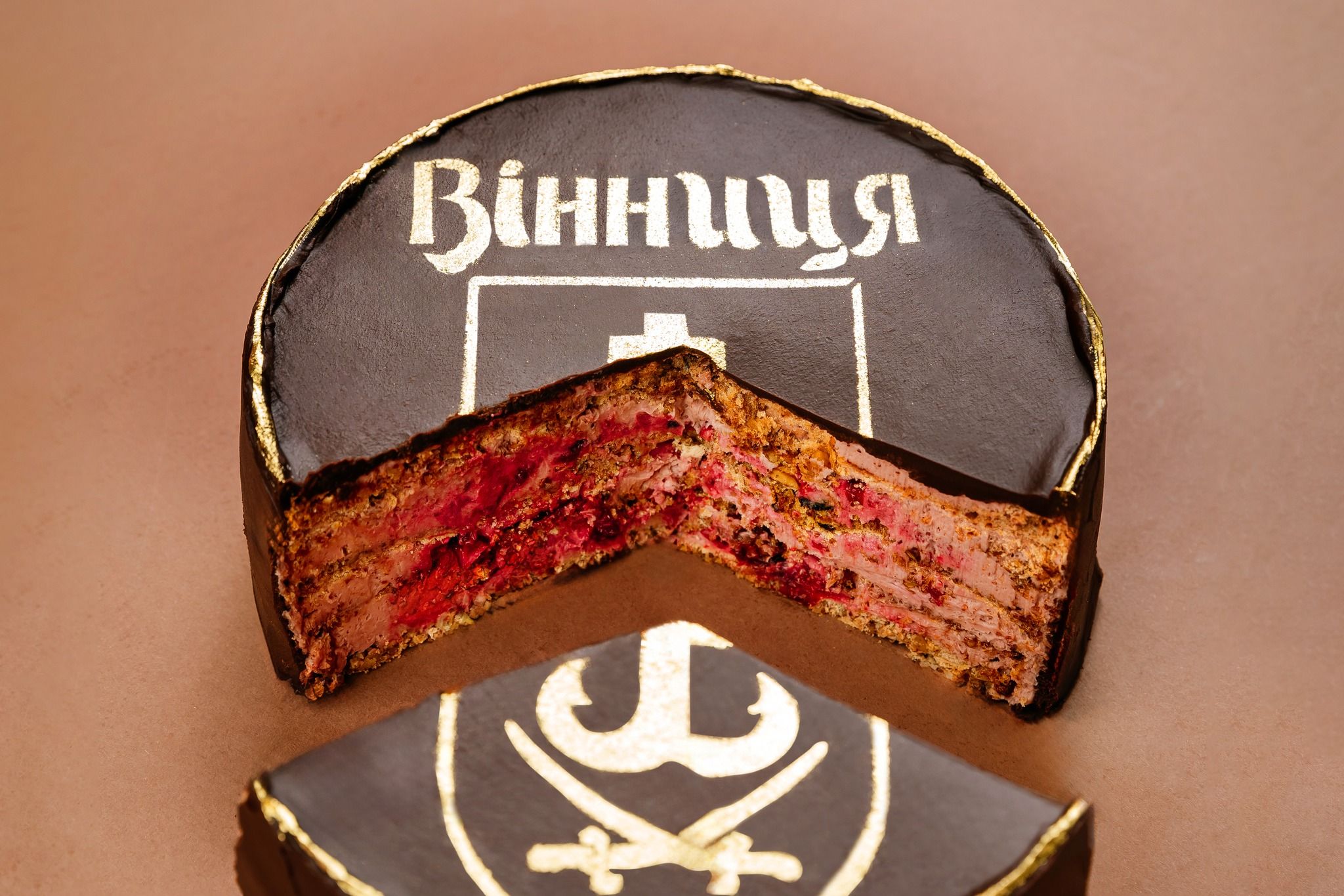 В основе торта белковые лепешки с добавлением гречневой муки, измельченных грецких орехов и вяленой вишни. А как иначе, если Виннитчина известна полями гречихи и обильными садами вишни. А в главном городе региона есть еще и река, и район Вишенка. Поэтому гречка и вишня в торте-визитке являются ключевыми ингредиентами. И, конечно, все это сдобрено небольшим количеством крема. Торт украшен шоколадным ганашем, на котором золотыми буквами изображено название и герб города.