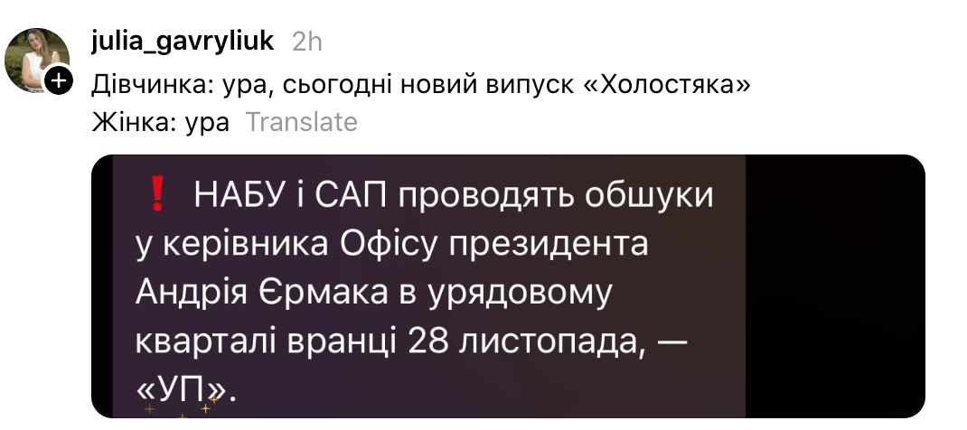 Утром 28 ноября Украину взбодрила новость, что у руководителя Офиса президента Андрея Ермака проводят обыски по делу «пленок Миндича», оно же о коррупции в энергетике. Новость в то же время оказалась в топе, обогнав даже «28 (или уже 19?) пунктов мирного плана», хотя на эту тему народ продолжает шутить. А, и праздники уже скоро. Готовитесь?