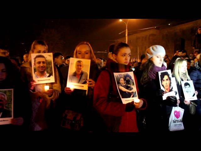 Вечером в центре города также собрались сотни горожан. Львовяне провели безмолвное шествие в память о Небесной сотне. Сотни жителей прошли по центру с лампадками и портретами погибших героев, а возле памятника Шевченко выложили Герб Украины из свечей.