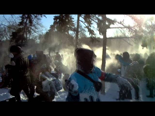 Едва успеваю "изготовить" первый снаряд, как на нас налетает орава "синих". Получив свою порцию, весь мокрый, отступаю за переднюю линию обороны. Снежки летят непрерывно, только успевай отворачиваться. Вот зазевался – и ледяной ком попал в лицо. Лыжная маска спасла от травмы. А в прошлом году, те, кто не подготовился к бою, уходили из парка с синяками под глазами. Но бой продолжается. "Синие" все наседают и наседают, постепенно оттесняя нас от пруда. Но вот один из парней, с песней "Выходила на берег Катюша", ринулся в атаку, а за ним еще человек двадцать. Стремительное контрнаступление позволило немного оттеснить врага обратно, но недолго. У "синих" свой план. Пока основная масса перекидывалась снежками в центре поля, несколько небольших групп из десяти человек зашли с тыла и решительным броском опрокинули наши ряды. Со стороны снежная битва напоминала печально известное побоище в Киеве на улице Грушевского, хотя пострадавших и раненых не было. Битва была настолько интенсивная, что через час лепить новые "снаряды" было не из чего.