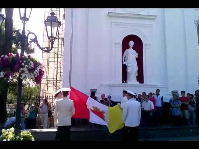 Бойцы почетной роты под гимн города – арию из оперетты "Белая акация", чеканя шаг, пронесли знамя перед мэром, почетными гражданами и представителями дипломатических миссий, а после торжественно подняли флаг на флагштоке. Вслед за этим прогремел салютный выстрел из старой трофейной пушки, установленной на Приморском бульваре. Из ее ствола вырвался длинный сноп огня и искр, которые испугали гулявших рядом детей. После этого специальная салютная установка выбросила в воздух букет фиолетовых конфетти, а школьники запустили в небо воздушные шары красного и желтого цветов, которые символизировали расцветку городского флага.