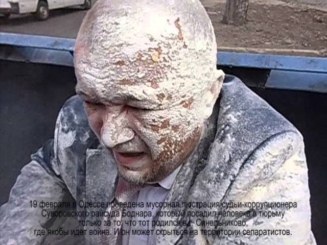 Активисты "Правого сектора" сняли и выложили в интернет короткий ролик, в котором неизвестные в масках, камуфляже и балаклавах прямо перед зданием суда схватили судью Суворовского райсуда Одессы Сергея Боднара, бросили в мусорный контейнер, высыпали на голову ведро муки, облили водой и захлопнули крышку.