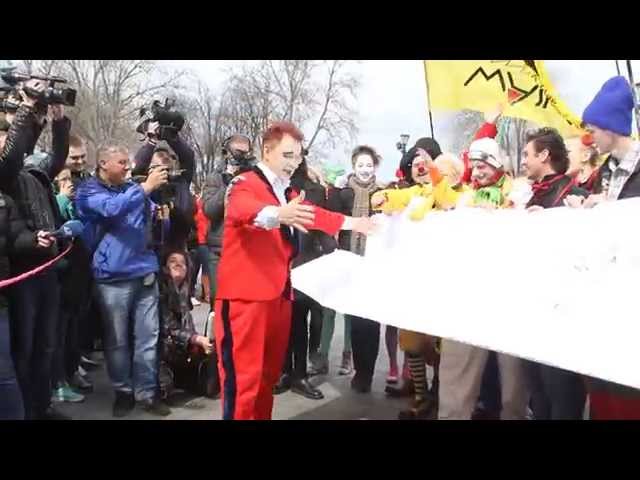 Уже с утра перед зданием "посольства юмора" комики репетировали проходку под задорные звуки оркестра. Юмористы в полосатых пиджаках, пышных юбках и ярких париках водили хороводы, жонглировали, дурачились, сражались надувными молотками, взрывали хлопушки.
