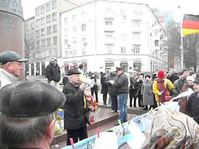 Спустя 20 минут митингующих осталось вдвое меньше, не позволил стоять холодный ветер и температура воздуха в Донецке +2 градуса.