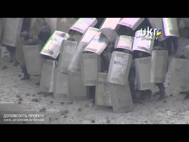 Священник вдруг подался вперед и рухнул - не успела подхватить. Это начался штурм. Милиция пошла вперед. Митингующие открыли огонь с дальних позиций. Швыряют камнями. Да, только не учли, что есть и буферная зона. Это сотня стариков, которые пришли стыдить милицию. Вот этой буферной зоне и досталось: камни, коктейли Молотова.