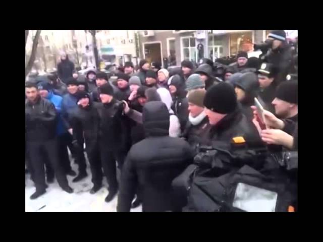 Неожиданно "спортсмены" с провластного митинга перешли дорогу и двинулись в сторону евромайдана. Проходя мимо протестующих, они кричали "майдан геть", вырывали из рук украинские флаги, толкали журналистов и били по камерам.