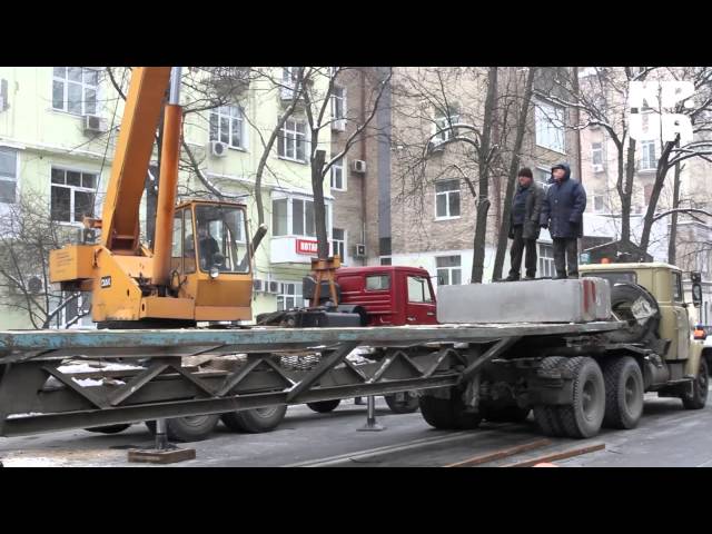 На углу Институтской и Шелковичной начался разбор баррикад. Бетонные плиты поднимают специально подогнанным для этого краном и грузят на КАМАЗ.
