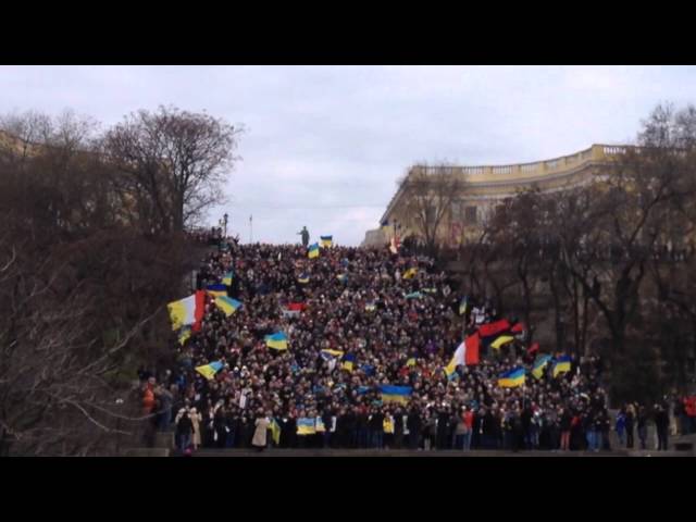 В знак поддержки крымчан, одесситы массово исполнили гимн Украины. На Потемкинской лестнице собралось от 2 до 3 тысячи человек - сторонники Евромайдана пришли, чтобы спеть гимн Украины вместе с одесской группой "Дюк Тайм".
