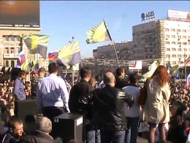 К счастью, все прошло достаточно мирно. Около пяти тысяч человек традиционно собравшиеся под российскими флагами на площади Ленина так же традиционно, немного помитинговав, отправились к облгосадминистрации. Понятно, перекрыв движение на центральной улице Донецка. Прибыв на место и увидев, что здание окружено пятью кольцами солдат, отправились по привычному маршруту дальше, к управлению СБУ.