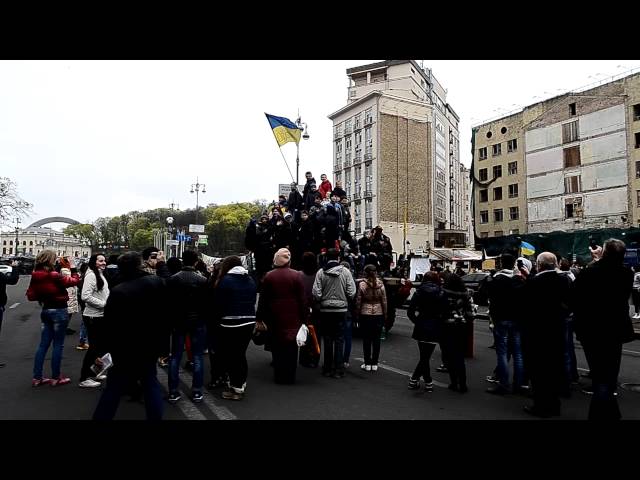 Сегодня днем на Крещатике водили несколько экскурсионных групп. Особой популярностью пользовался БТР, который остался со времен столкновений в центре города (стоит он между центральной площадью и Европейской площадью). Мы застали момент, когда сорок школьников "облепили" боевую машину. Боец из самообороны пытался их прогнать, мол, чтобы не портили технику. Но после нескольких попыток сдался со словами "Попробуй эту ораву прогнать!" Дети взобрались на боевую машину пехоты и на ней исполнили гимн страны. Руководила этим процессом одна из классных руководительниц. Закончили развлечение школьники уже традиционным приветствием "Украине слава! Героям слава!"