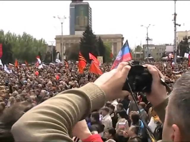 Шествия и митинги в честь 9 Мая в Донецке не заканчиваются. Утро началось традиционными возложением цветов к военным памятником и парадом. Продолжилось – митингом сторонников Донецкой народной республики.
