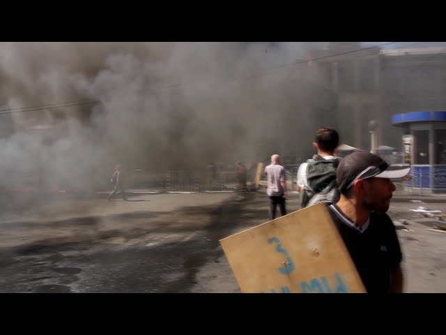 Из-за дымовой завесы вдруг показались бойцы "Киев -1" (это добровольцы под эгидой МВД). Бойцы отступают. Их теснит кучка майдановцев: без оружия и дубинок. Они прут на щиты: с голым торсом, в копоти. Их главное оружие - истошный крик: "Менты - гады! Продались за 2 тысячи! Позор! Слава Украине!"