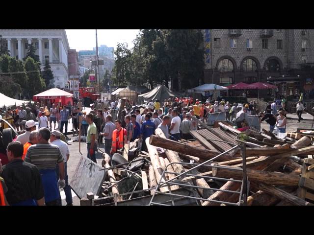Вечером в пятницу, 8 августа, на Майдане стало одной баррикадой меньше. Коммунальщикам таки разрешили снести завал, который находился чуть дальше Дома Профсоюзов. Всего за вчерашний день смогли расчистить Крещатик от Европейской площади и до самой сцены. Всего вывезли 20 машин мусора!