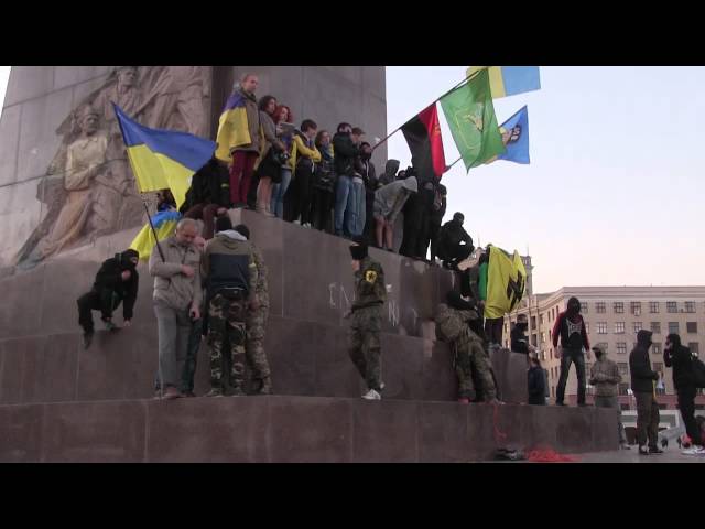 Постамент, где вчера еще стоял бронзовый Ленин, сегодня снова в центре внимания. Одни идут на площадь Свободы, чтобы воочию убедиться, что вождя пролетариата больше нет, другие, не скрывая слез, кладут на ступени памятника цветы, перевязанные георгиевскими лентами, и возмущаются произошедшим варварством.