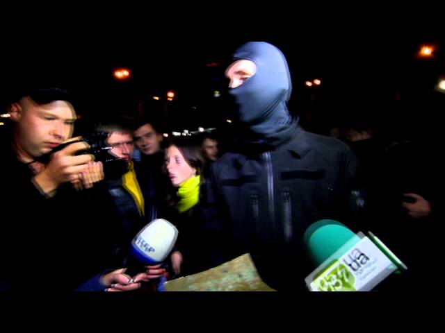 18:00. В ожидании техники самые нетерпеливые попытались взобраться на постамент, выстроив живую пирамиду. А затем, когда кто-то принес отбойный молоток, на граните решили "написать" "Слава Україні". Почему милиция допускает подобный вандализм - непонятно. По словам очевидцев, правоохранителей не видно не только возле памятника Ленину, но и по периметру всей площади.