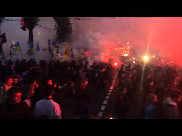 19:00. КИЕВ: Колонна митингующих двигается очень быстро. Весь центр - бульвар Шевченко, Крещатик - в дыму, постоянно взрываются файеры и питарды. Активисты идут громко – выкрикивая слоганы "Одна, єдина, соборна Україна" и "Бандера прийде - порядок наведе".