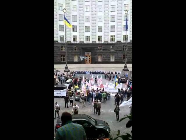 Милиционеры, охраняющие вход в правительственные палаты, на происходящее реагировали спокойно, без лишних эмоций. Сами митингующие тоже особой агрессии не проявляют. Их всего около 50-70 человек. В руках у них украинские флаги и знамена.