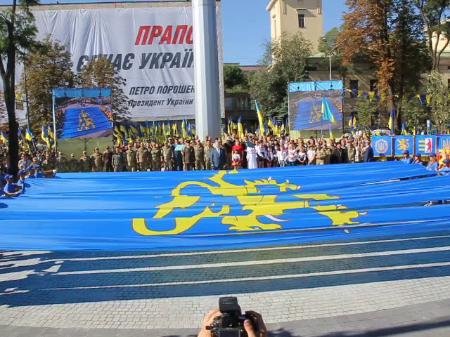После того, как флаг благополучно поднялся на нужную высоту, а поздравления были сказаны, состоялся небольшой флешмоб, во время которого президенту и присутствующим показали историю украинских флагов и государственных символов. По хорошей днепровской традиции, финальную точку в действе поставил сам Петр Порошенко, вместе со студентами составив из желтых и голубых лент современный украинский флаг.