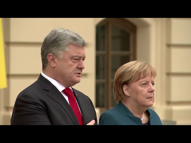 Для своего визита Меркель выбрала синий пиджак, будто в тон украинскому флагу. Как и в 2014 году канцлер получила из рук президента Украины белые розы. Петр Порошенко встретил коллегу на крыльце Мариинского дворца, внутри лидеры провели встречу "с глазу на глаз". Перед тем как уйти на переговоры, канцлер Германии поприветствовала караул на украинском языке. Также она подала руки присутствующим вице-премьеру Геннадию Зубко и министрам – иностранных дел и инфраструктуры.