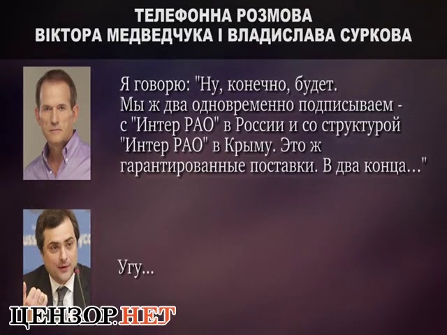 25 февраля издание "Цензор.нет" аудиозапись якобы разговора бывшего помощника президента России Владислава Суркова и главы политсовета ОПЗЖ Виктора Медведчука, которые в 2014 году обсуждали поставки электроэнергии в оккупированный Крым и обмен пленными на Донбассе.