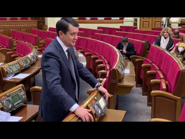 После заседания глава Верховной Рады Дмитрий Разумков пригласил журналистов в сессионный зал. Он показал, как работает сенсорная кнопка в системе голосования Рада-3. Об этом телеграмм-канал "КП в Украине".
